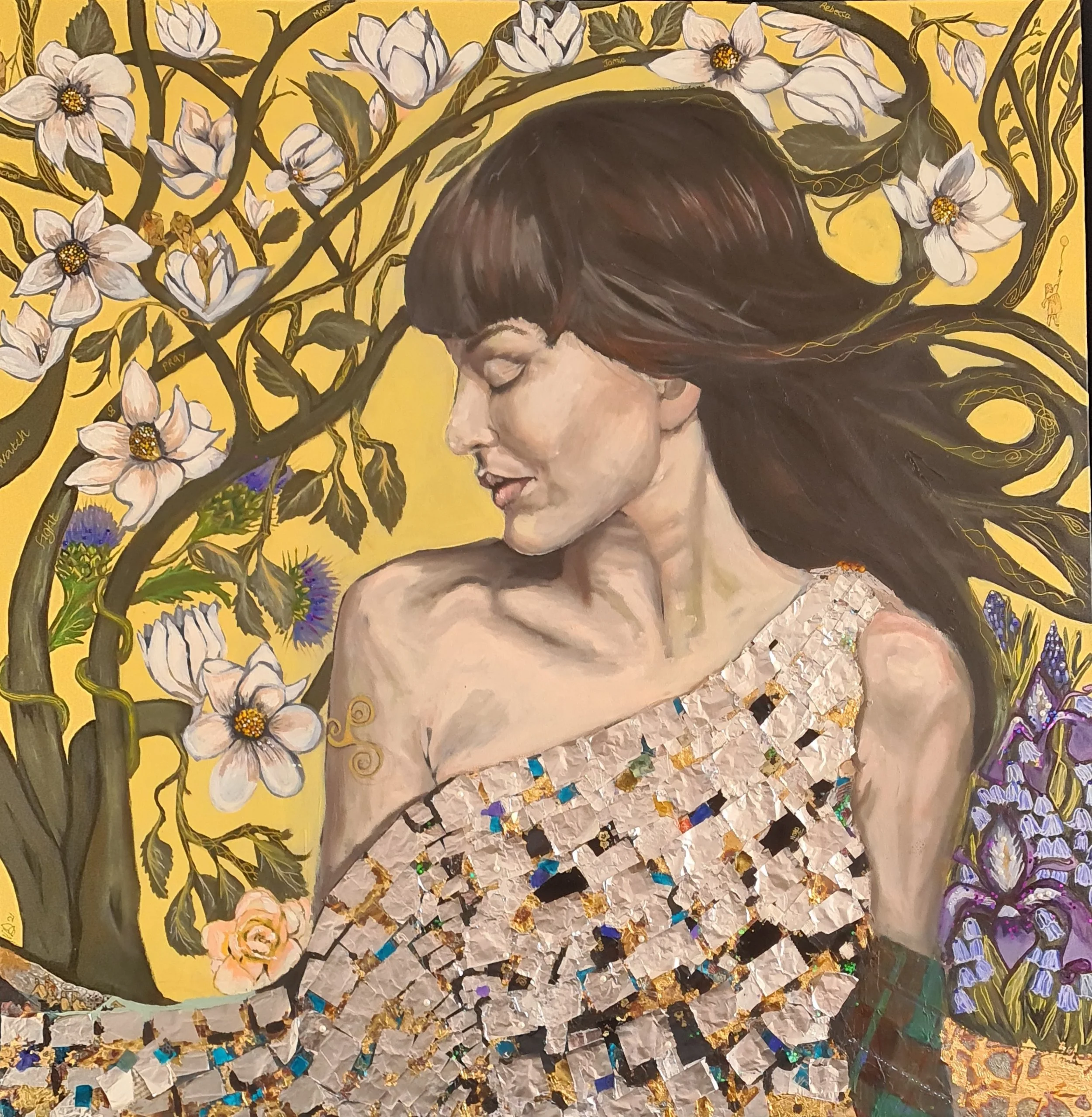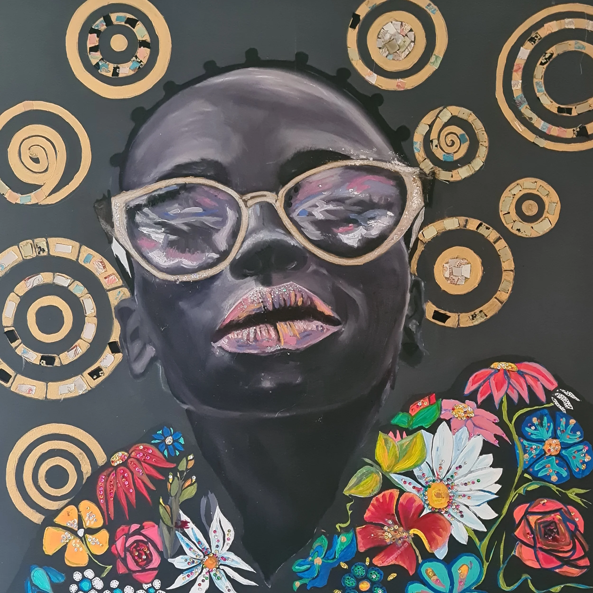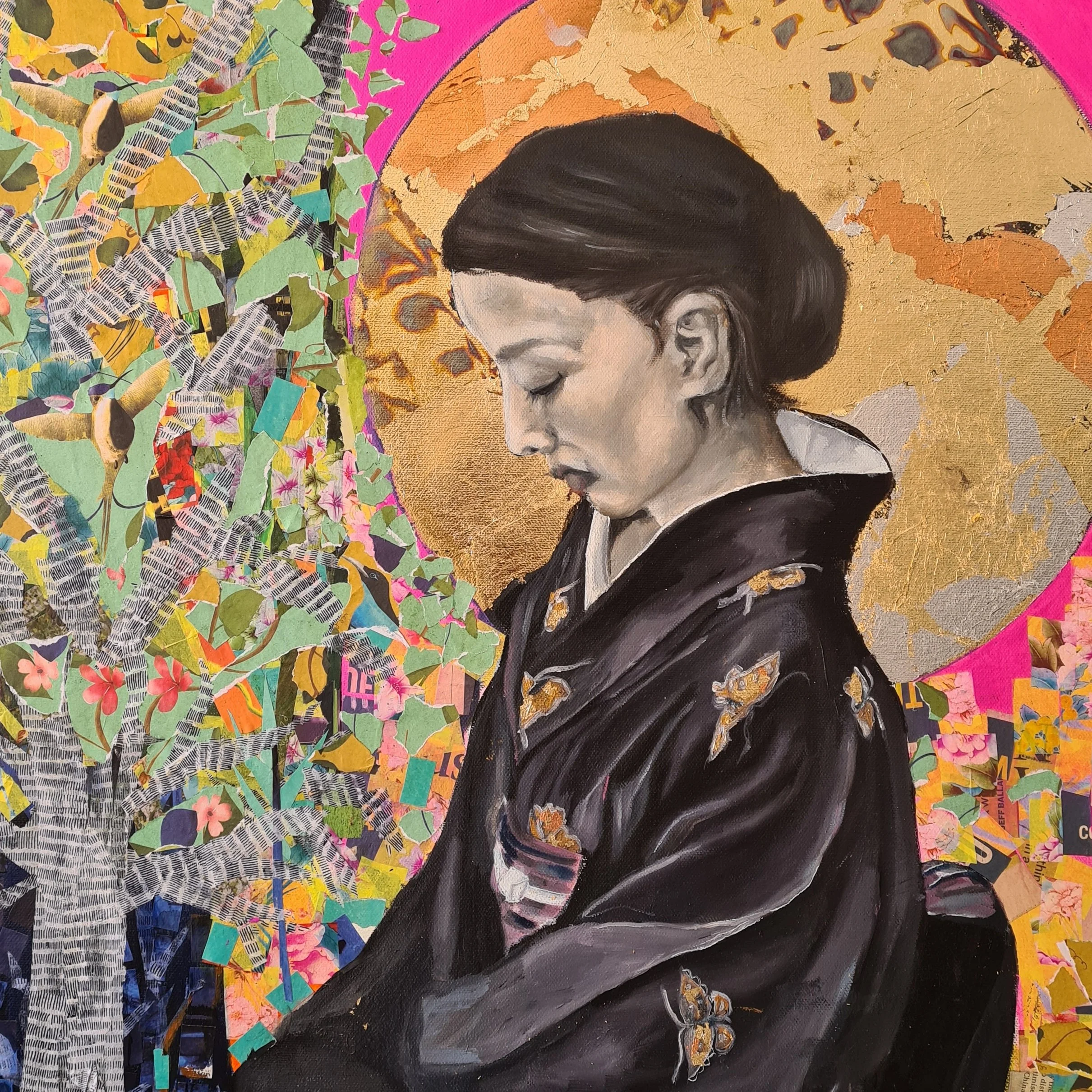 Oils with gems and sequins with fabric and paper collage on canvas.